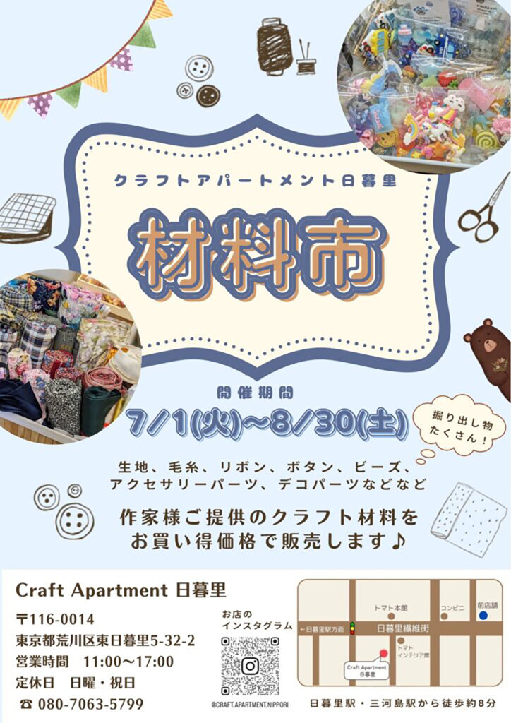 まず、7月1日〜8月30日まで開催の「材料市」は、ハンドメイドクリエイターが提供する手芸・クラフト材料がお買い得価格で手に入るイベント。