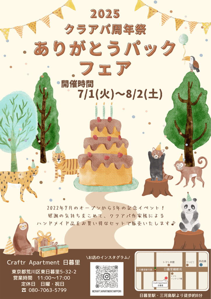 都内屈指の繊維街として知られる「日暮里」エリアで、60名以上のハンドメイドクリエイターの作品を販売するレンタルボックススペース「クラフトアパートメント日暮里」で開催中の、手芸・クラフト材料のセールイベントと、ハンドメイド作家の作品をパッケージにして販売する物販イベントです!