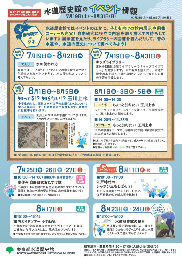 知らないことだらけの水道の様々な情報が得られる同館を舞台に、水道や水道の歴史、江戸時代の水道事情などが分かる、自由研究にも役立つ色々なイベントを実施します!
