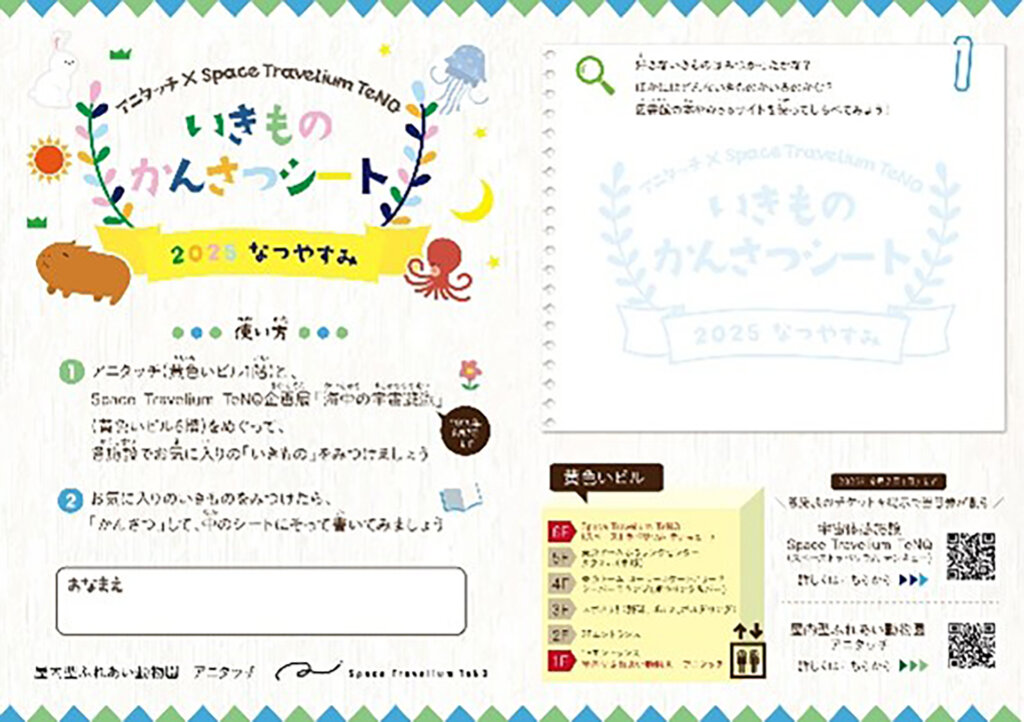 7月19日(土)~9月7日(日)には、同館と、同じ東京ドームシティ内にある動物との触れ合いが楽しめる常設スポット『アニタッチ 東京ドームシティ』とコラボし、両施設の相互割引サービスを実施。平日来館すると、小学生を対象に自由研究にも使える「いきものかんさつシート」が先着でもらえます。