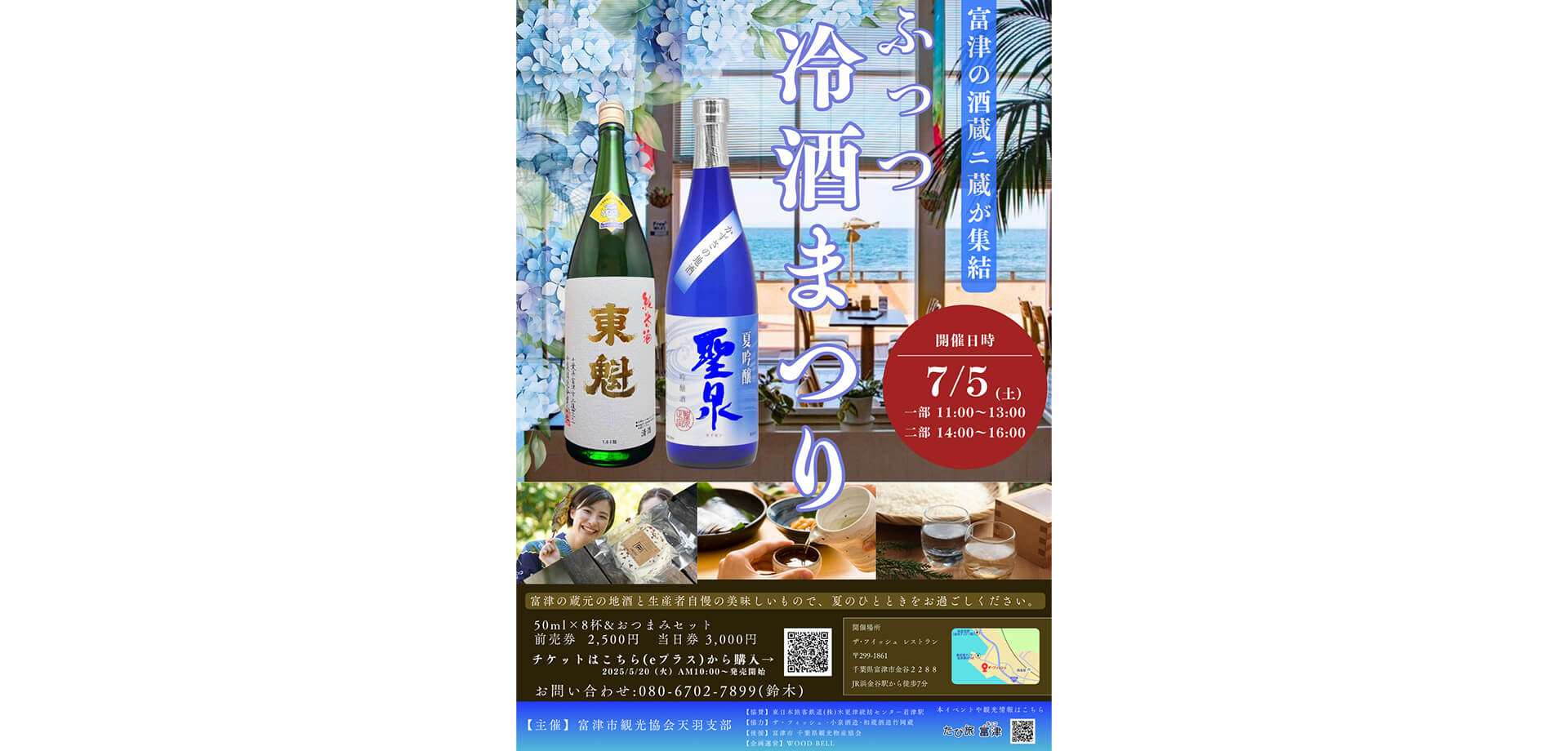 前後二部制で開催予定となっており、試飲チケットには、50ml×8杯分のほか、富津市内の新鮮食材を使った、日本酒にあうおつまみがセットとなっています。