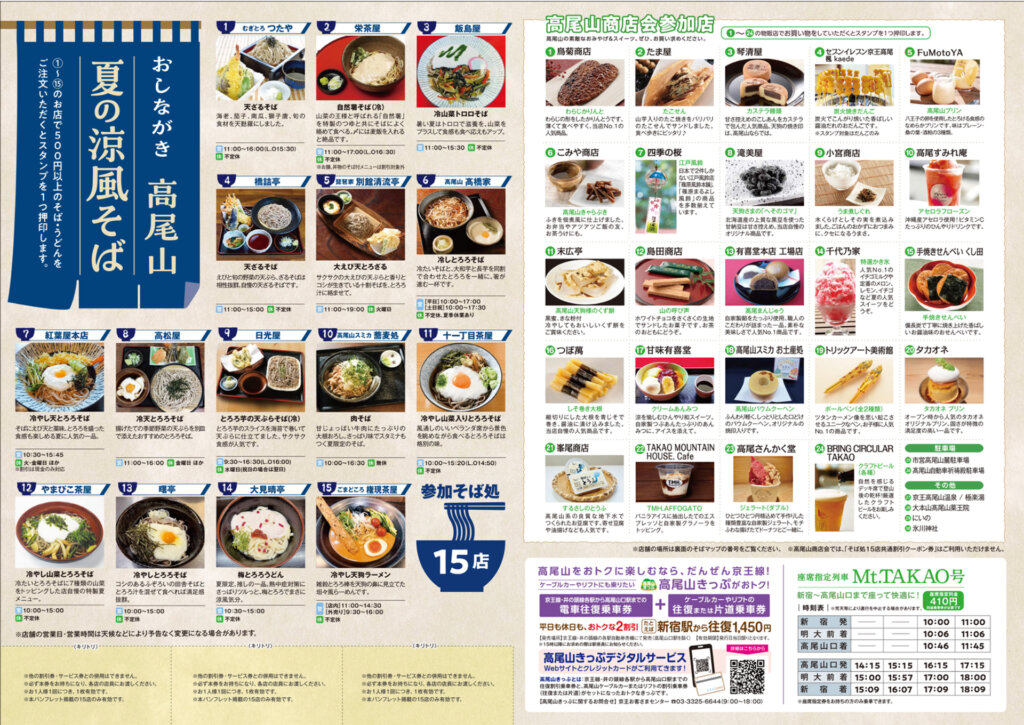 高尾山周辺にはおいしいおそば屋さんがたくさんありますが、それら人気店でお得におそばを楽しんでもらえればと、50円引きのクーポン付きリーフレットを京王線各駅で無料配布中です!