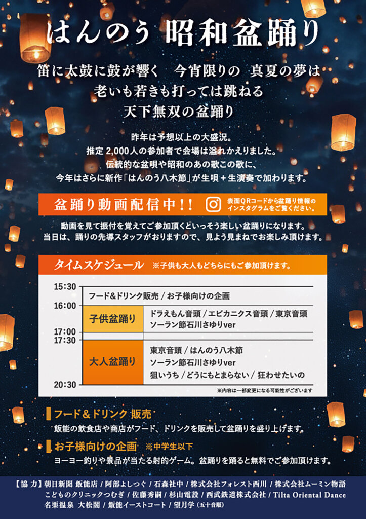 老若男女誰もが楽しめる“天下無双の盆踊り”として、昭和の名曲はもちろん、「ソーラン節」や「東京音頭」といった盆踊りの伝統的演目や、新作の「はんのう八木節」を生唄&生演奏で披露するなど、懐かしさと新しさがシンクロした盆踊りイベントとなっています。