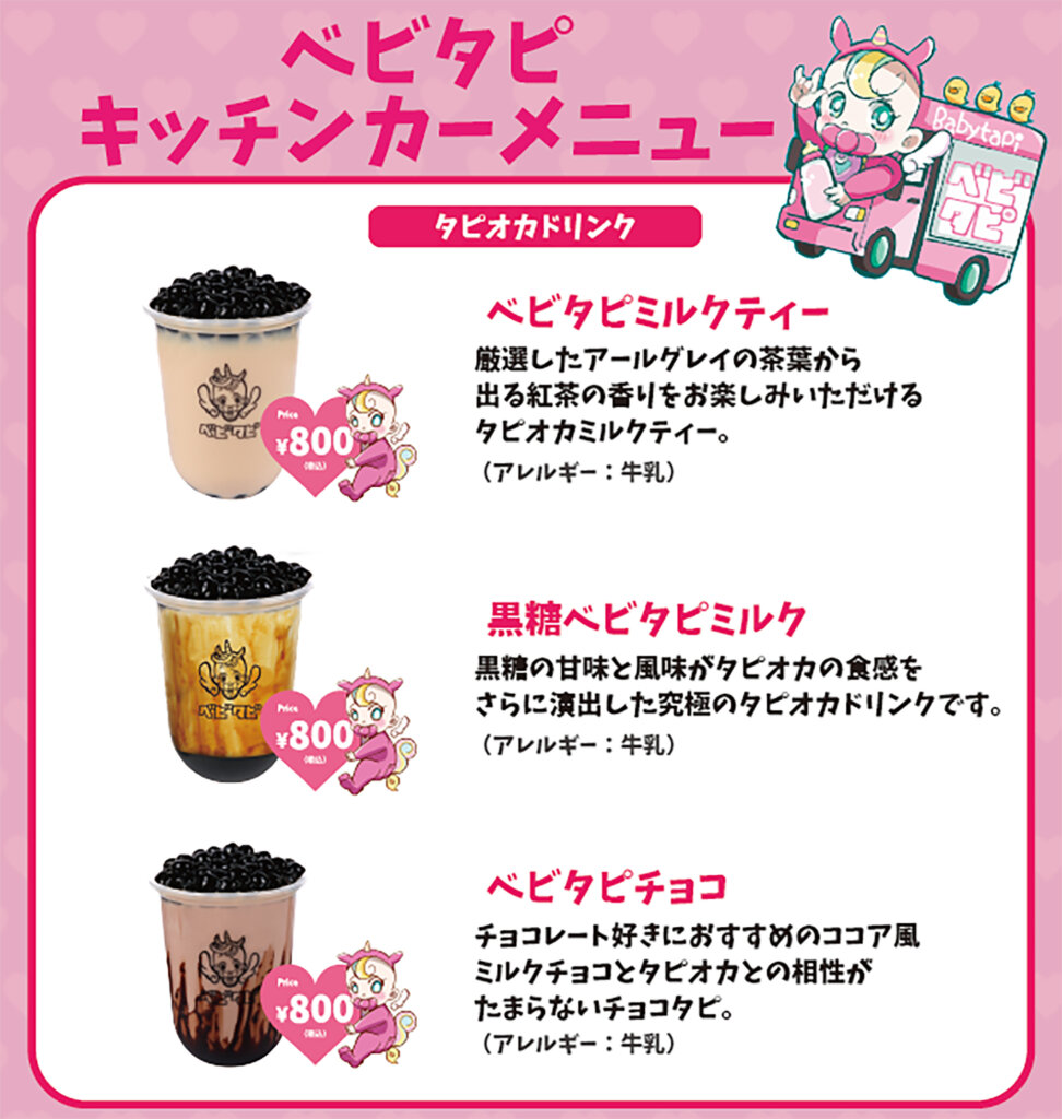 ベビタピの世界観からインスパイアされた4種類のコラボフード(クレープなど)もあります!