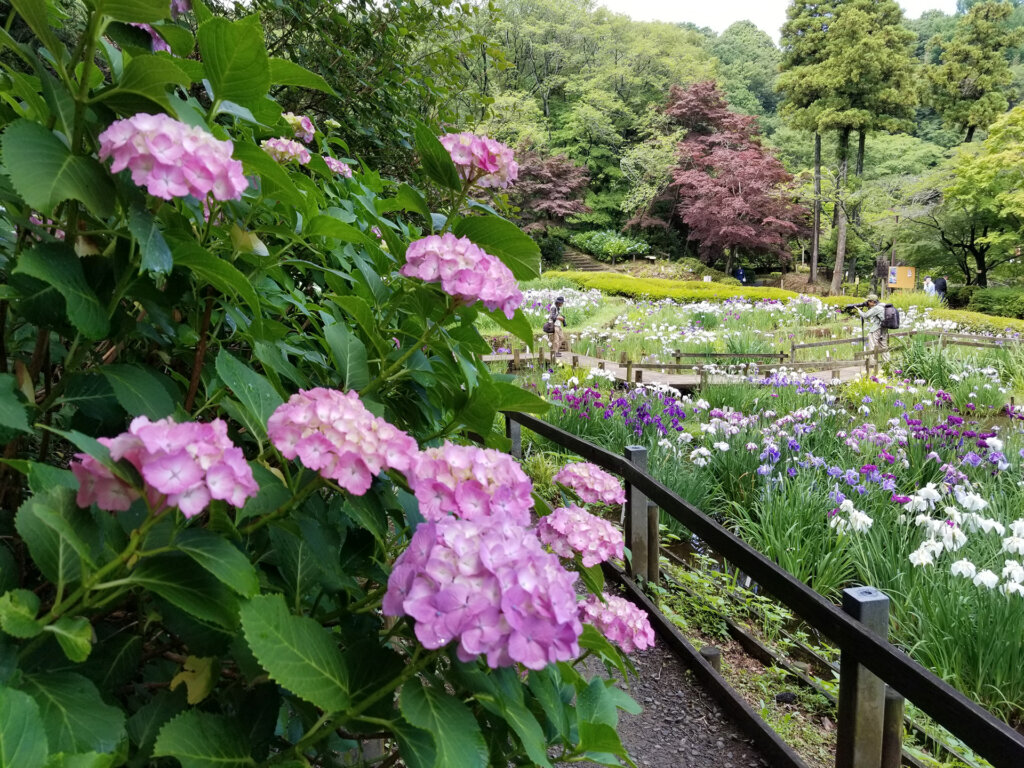 「薬師池」と、そこから徒歩圏内にある「えびね苑」の2箇所で同時に行われるもので、例えば薬師池会場では、175品種約2200株の花菖蒲と、42品種約1000株のあじさいを同時に楽しめます。