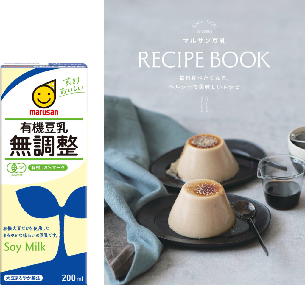 【来場特典】「有機豆乳無調整200ml」(左)、【SNS投稿特典】レシピブック(右)