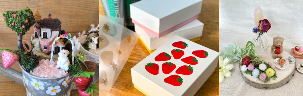 ほかにも、事前申し込み制でワークショップを開催。小さないちご王国作りが楽しめるミニチュア作りや、アクリル絵の具を使っていちごを描くポストカードボックス作りなどを行います。