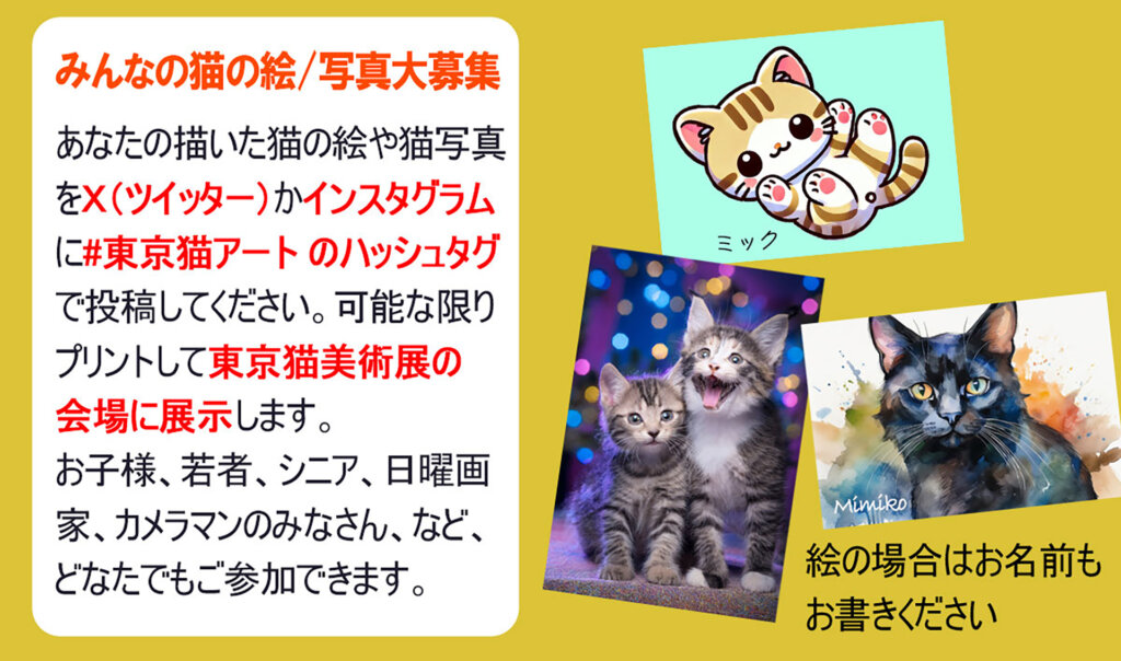 自慢の猫の絵や写真を、「#東京猫アート」のハッシュタグをつけてXやインスタグラムに投稿してもらい、うち300枚あまりをハガキサイズにプリントして会場に展示する計画もあり。
