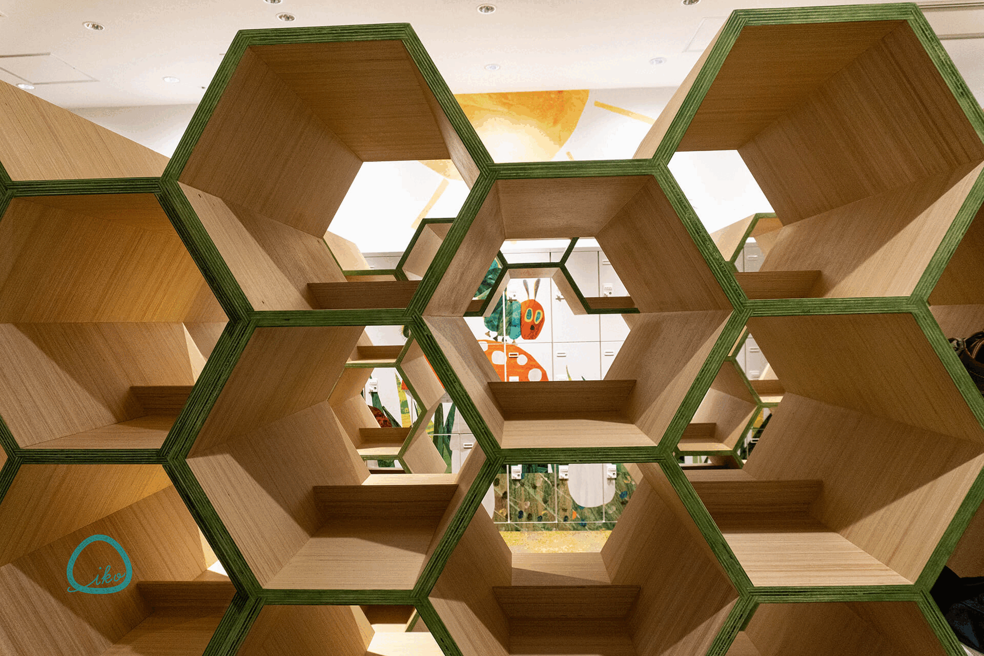施設内はすべて土足禁止。入り口ゲートをすぎるとまずめにするのが、このシューズボックス。思わずええ〜っとなること間違いなしです♪ 蜂の巣を模した、ユニークなハニカム仕様になっているんです!