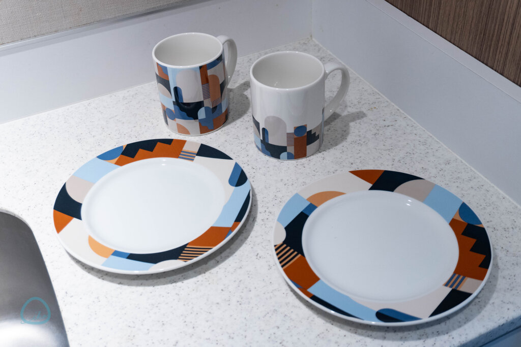 各部屋に常備されているマグやプレートも、リニューアルにあわせ新調。このほかに同柄のボトルもあり、3点すべて販売もしています。1500円〜。
