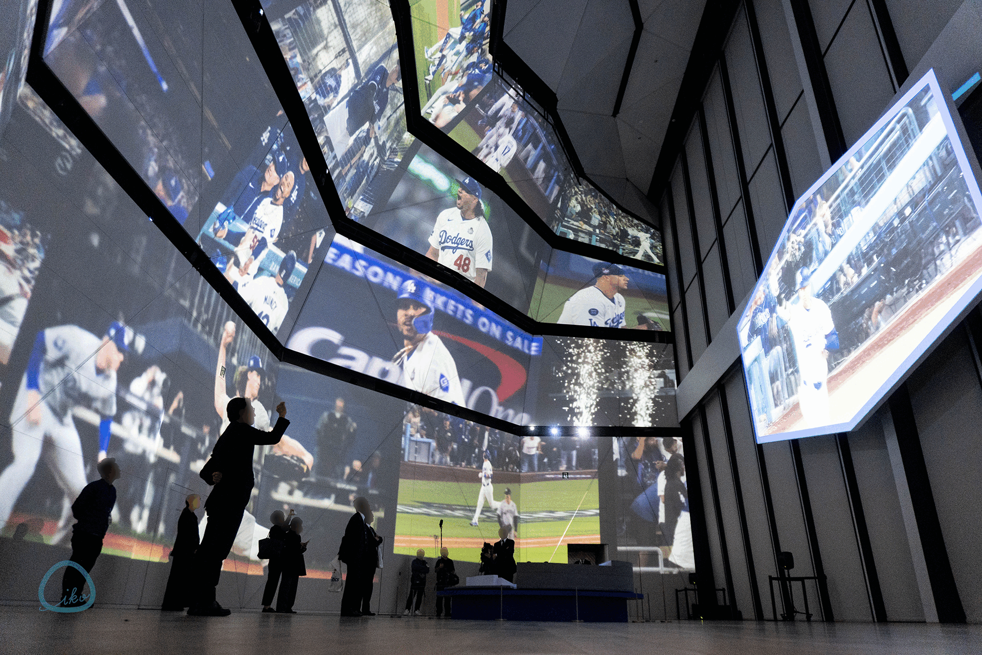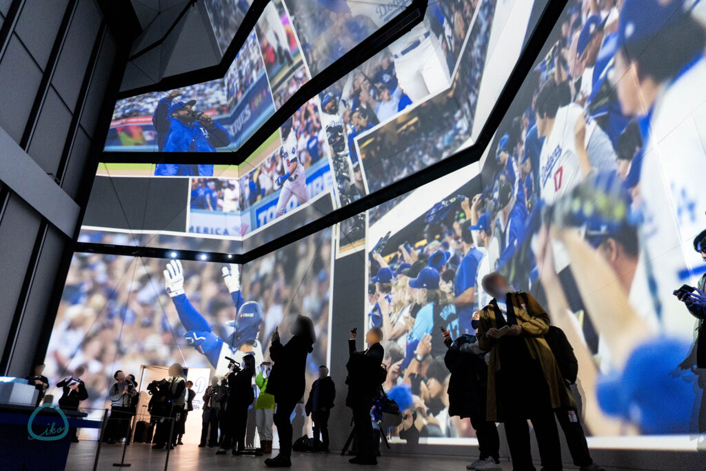 来場者の気分をいきなり急上昇させる、入場後まず味わうイマーシブエリア。中央にはドジャースタジアムの模型風オブジェも。ずっと見上げ続けるため、じっくり堪能するのであれば、いっそのこと座って鑑賞する!?
