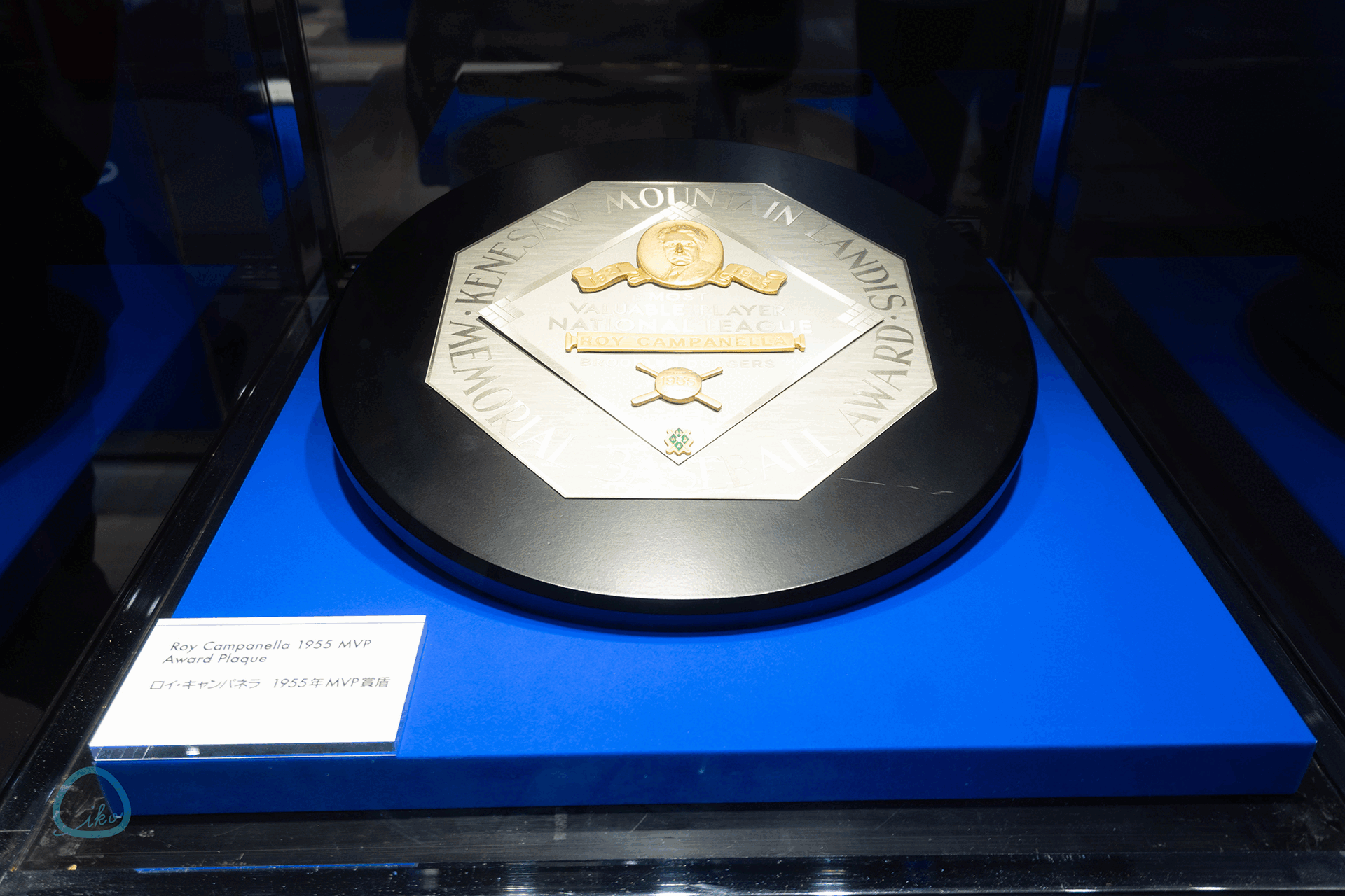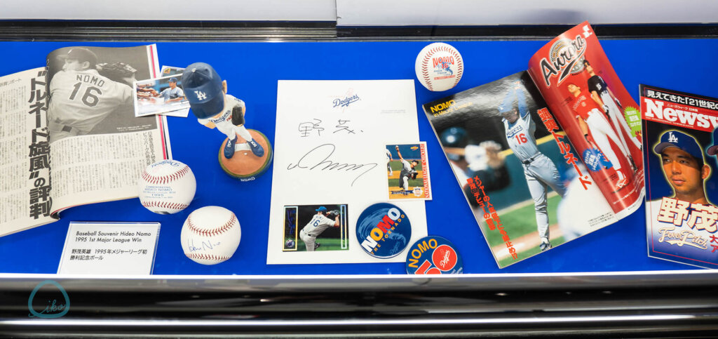 名選手の功績を称える数々の記念品だけでなく、クレイトン・カーショウ選手が歴代奪三振王を達成した際の、マウンドの砂が付いたスパイクまでも展示! 野茂さんが受賞した、1995年の新人賞の盾も!