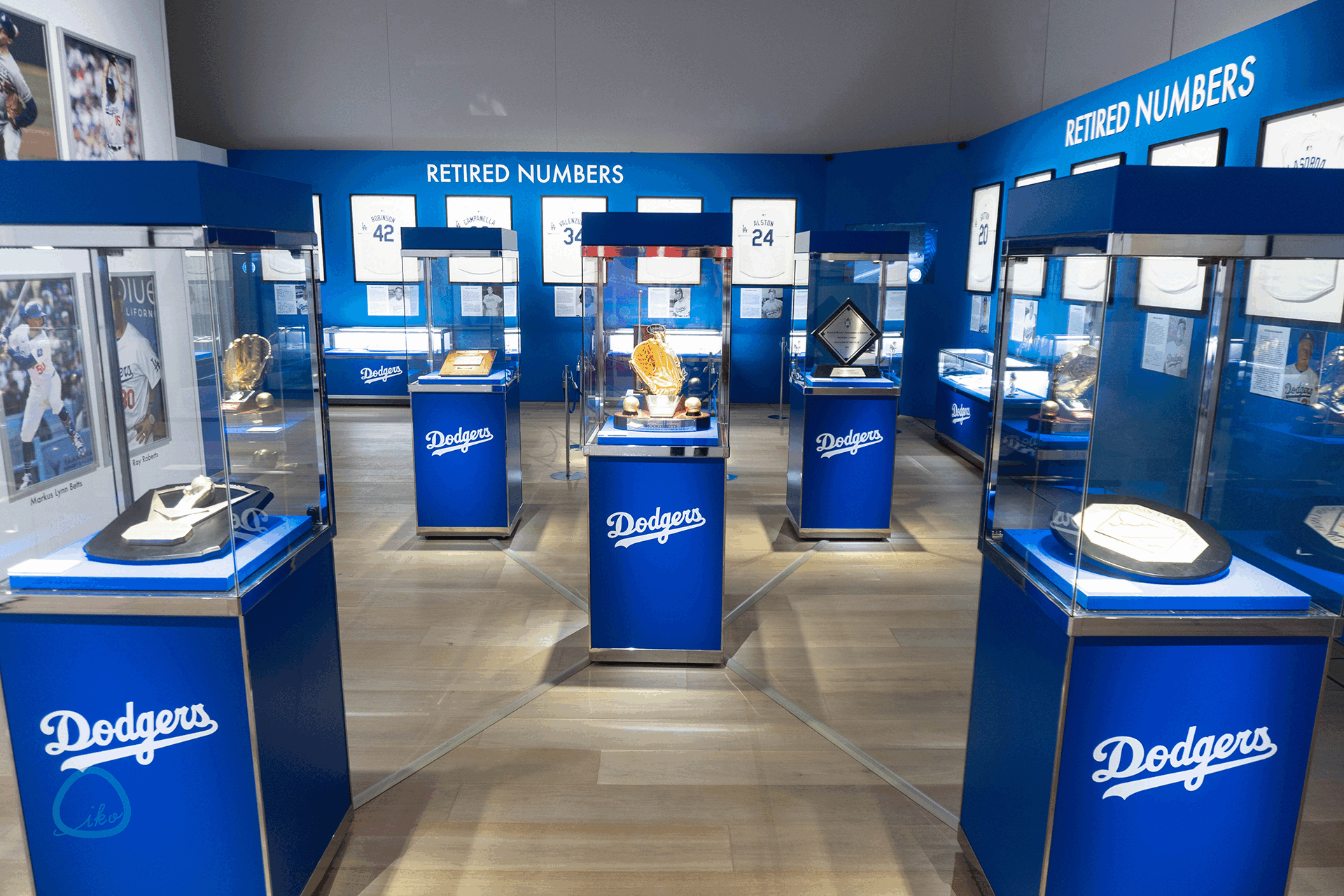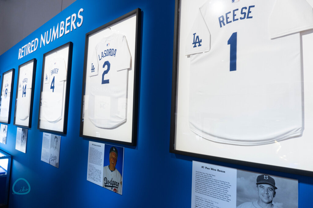 ドジャースで活躍した引退した名選手、監督を称える球団永久欠番選手のユニフォームコーナー。日本でも馴染み深いラソーダ監督も!