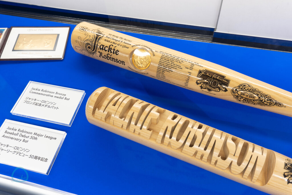 ドジャースは多様性を重んじる球団と関係者が語っていましたが、それを象徴するのが、故ジャッキ−・ロビンソン。黒人初のメジャーリーガーとしてドジャースで活躍し、現在全球団で「42」は永久欠番に。そんな故人のMLBデビュー50周年記念バットも!