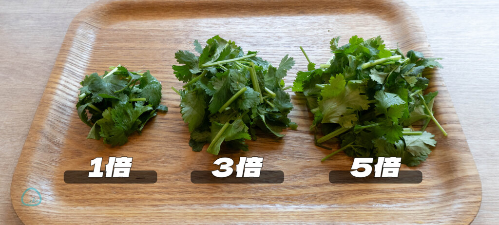 写真はあくまでイメージですが、「1倍」のほか、「3倍」「5倍」と全3種類から選ぶことが可能。基準(定番)が「3倍」となっており、初心者はパクチーがやや少ない「1倍」、パクチー信者は「5倍」がおすすめという構成です。