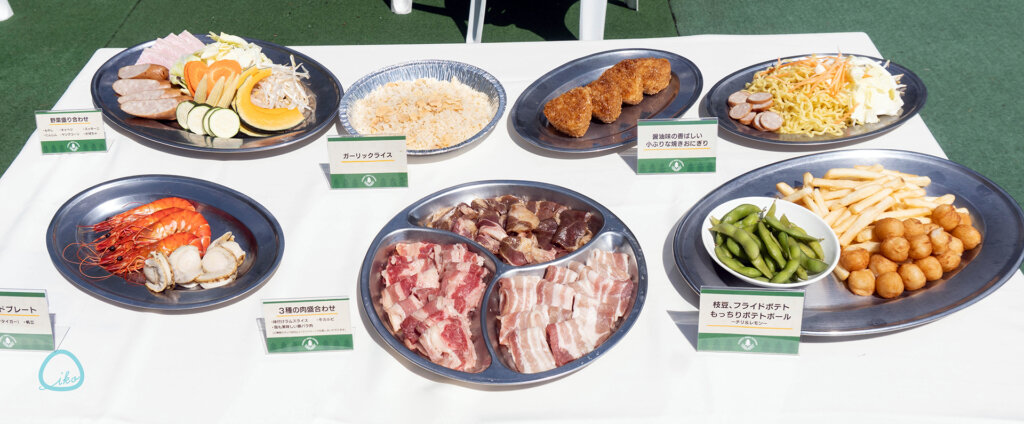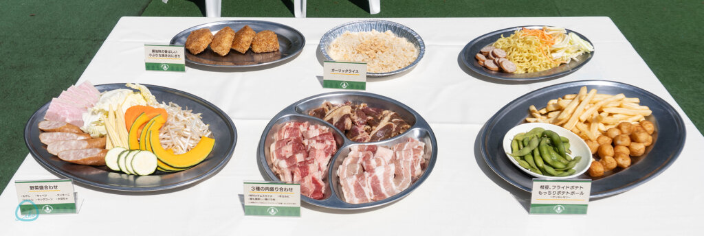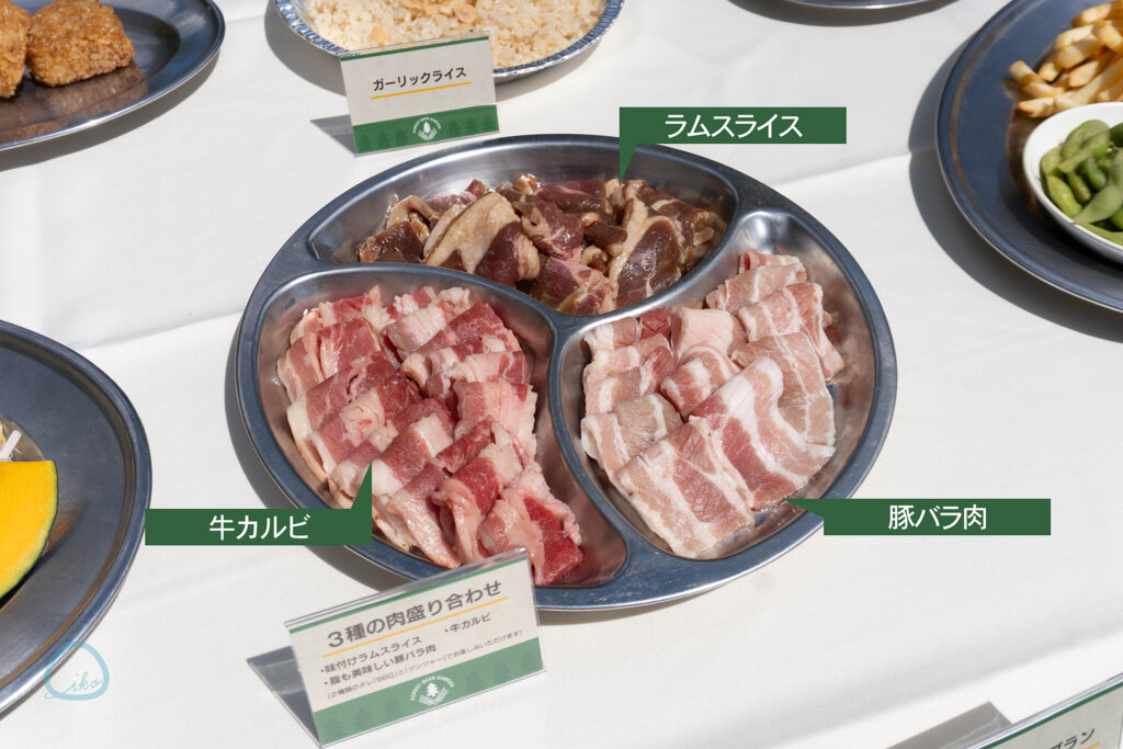 ●肉類・・・5種類(牛カルビ・豚バラ肉・味付けラムスライス・厚切りベーコン・ソーセージ)