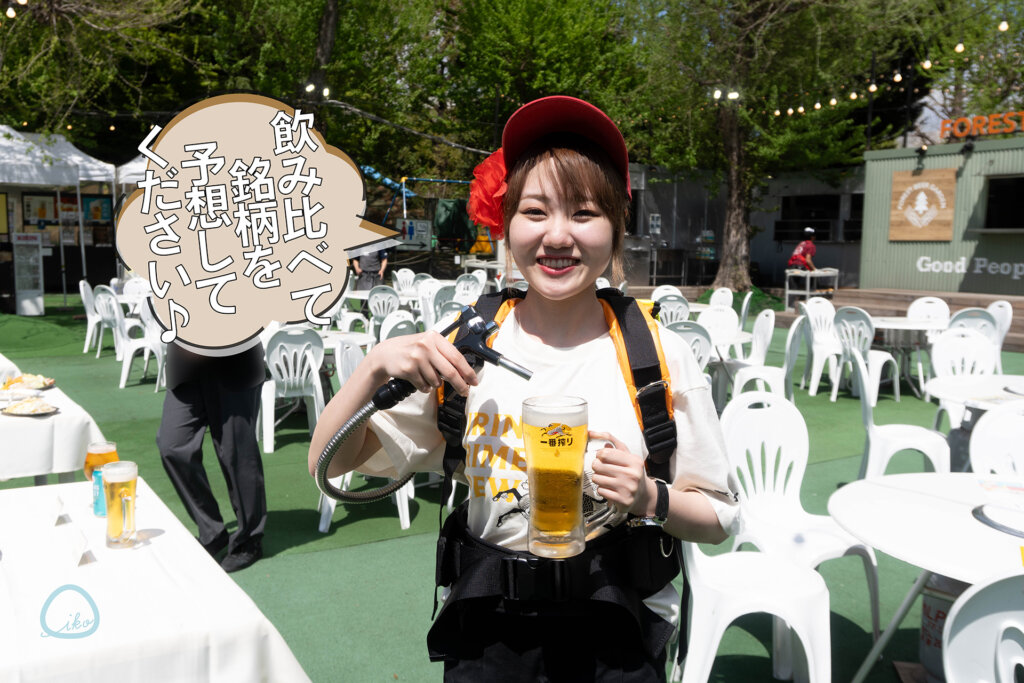 会期中盤には「利きビール」イベントを開催。7㍑のビール樽を背負った売り子さんからビールを注いでもらい、その銘柄がなんであるかを当てるというシンプルなもの。