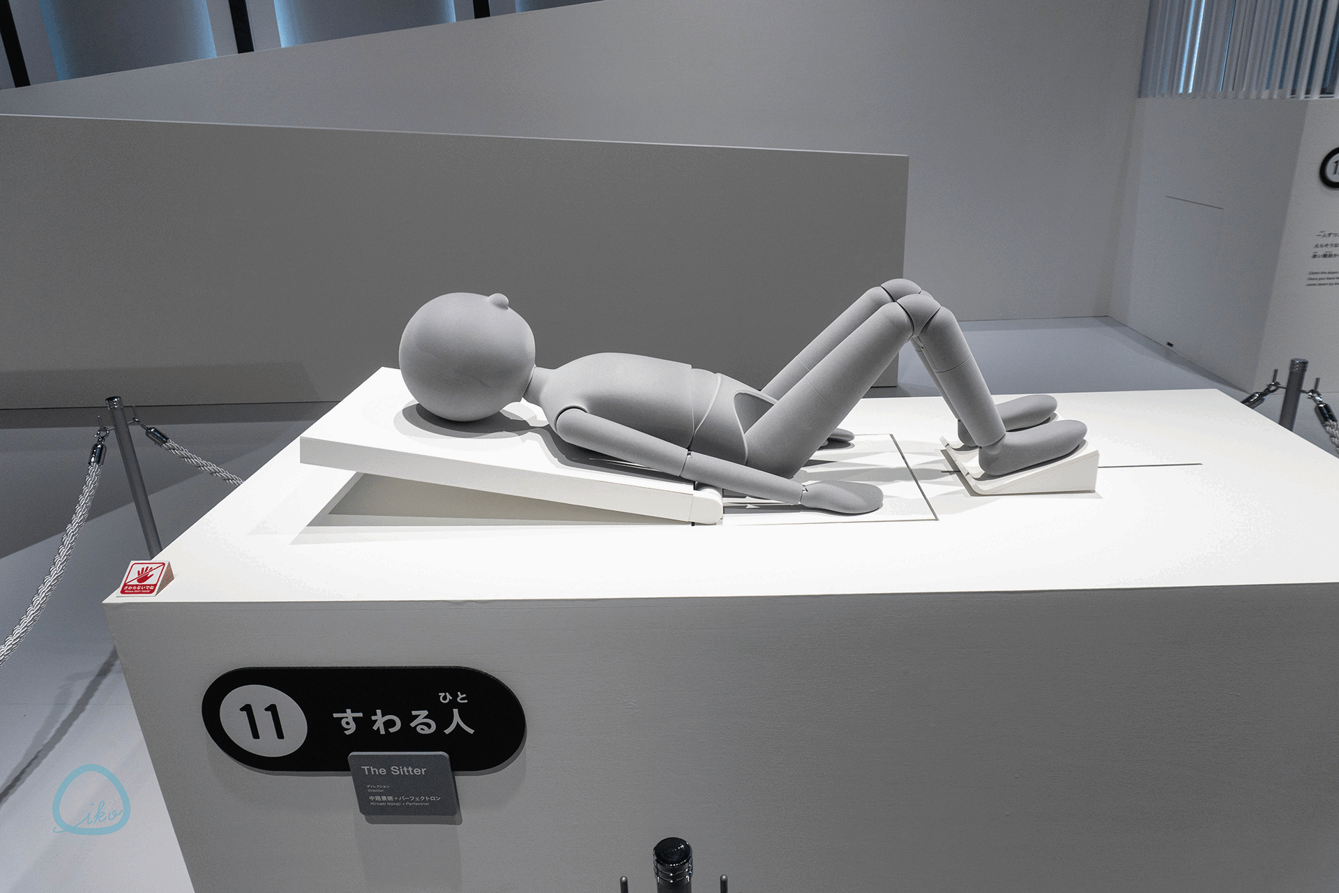 《すわる人》は、ゆっくりとつねに形が変わる椅子に座り続ける人の作品。椅子が変わると「座り方」も変わることが判ってもらえるハズ。