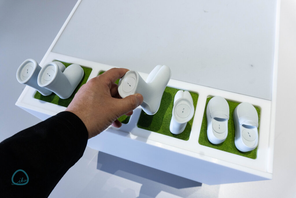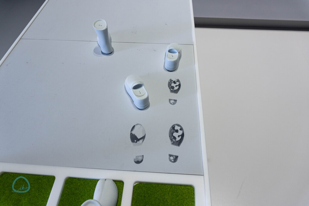 靴が置かれている芝生部分が湿っており、歩くと足跡が残るというもの。目的によって異なる足跡の違いに注目あれ。足跡は10秒程度で消えます!