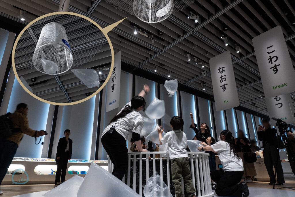 子どもたちがキャッキャと群がって遊んでいた《るてす》は、重力に逆らってゴミを捨てる装置。天井に吊されたゴミ箱に向かって、フロア中心に据えられた大型ファンの力を借り、ゴミを見立てた風船をシュートするという遊び。
