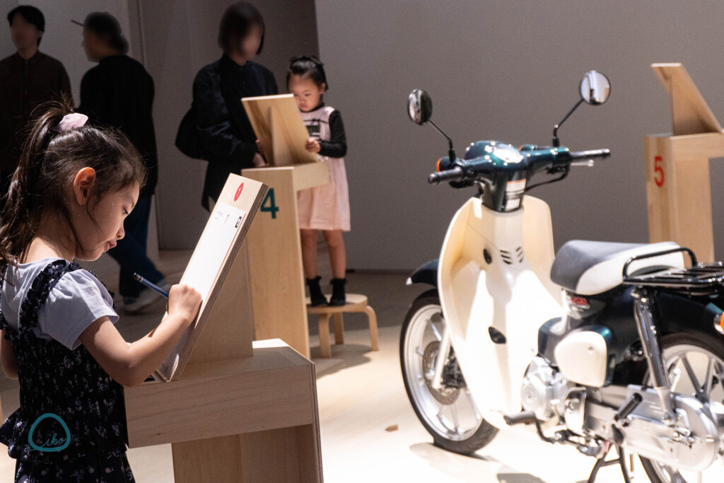 中央に展示されているホンダ・スーパーカブを、好きな角度からデッサンする「かく」体験コンテンツ。デッサンし終わった作品はスタッフがスキャンしてくれ、それが目の前の大型モニターに投映されるだけでなく、公式サイトにリアルタイムで反映されるそう! ちなみに作品は持ち帰りOK。