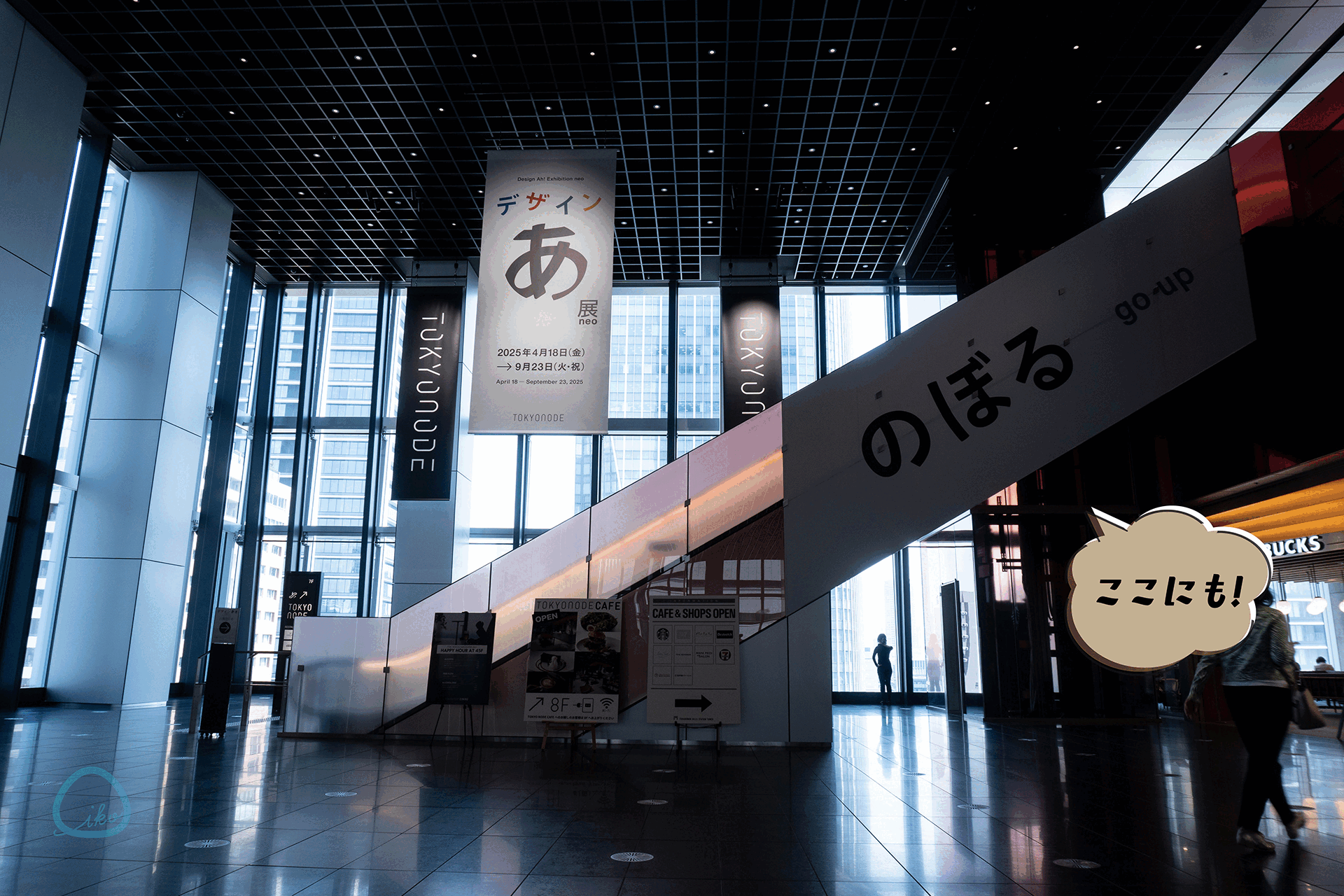 その道中にも、ご覧のような「のぼる」「まがる」などの、展覧会と連動した動作を示す文字が。案内に従って行動すると、自然と会場にたどり着く仕掛けとなっています。