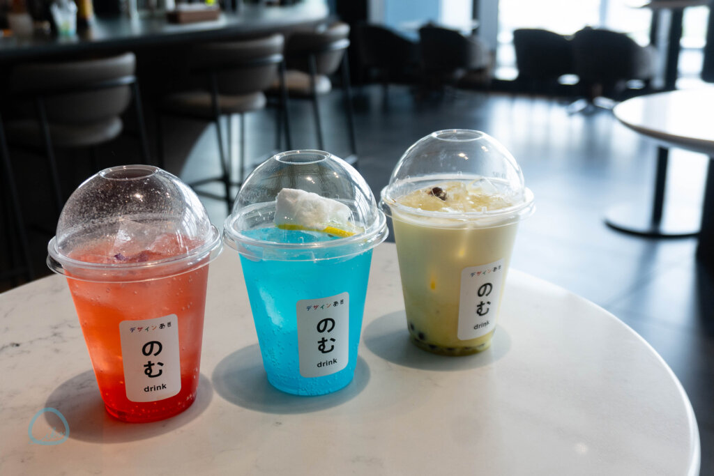 展覧会会場と同じ45Fでは、3種類から選べる「のむ」オリジナルドリンクを提供。テイクアウト可能です!