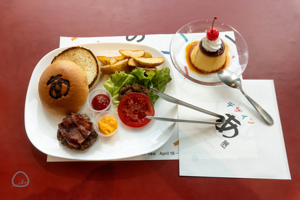 8Fにあるカフェでは、「のせる」「はさむ」「たべる」の3動作を1度に楽しめる自分で作るバーガーのほか、会場内の1作品である《おいしそう!?》とコラボしたプリンなど、15種類の限定メニューを販売中です。