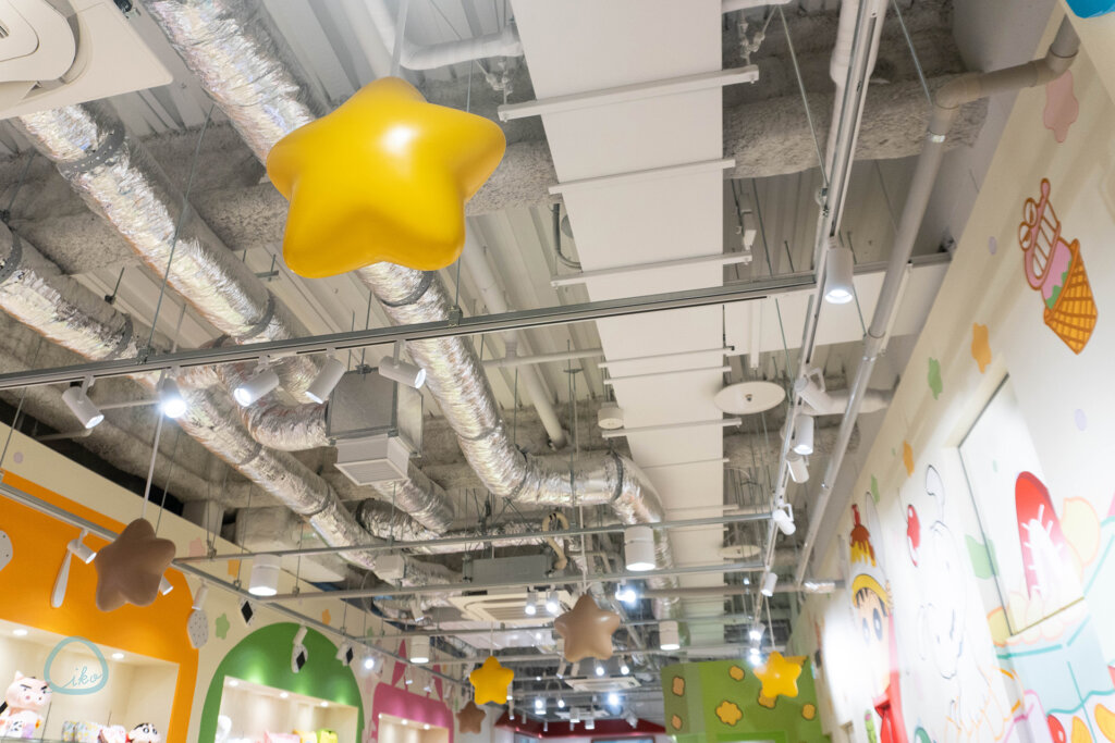 上にも目を向けてください! 天井から吊り下がる星は、チョコビですヨ〜。
