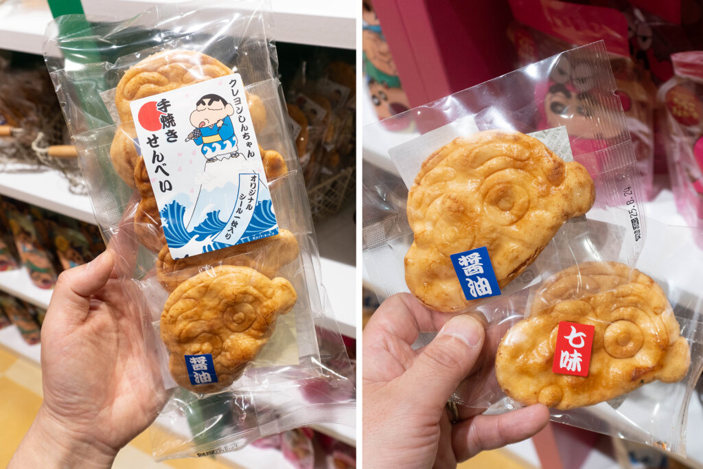 話題のしんちゃんの顔を模した「おせんべい」もありますヨ。しんちゃんは海外人気も高く、日本ならではの商品としてインバウンドの方からも人気なんだそう。