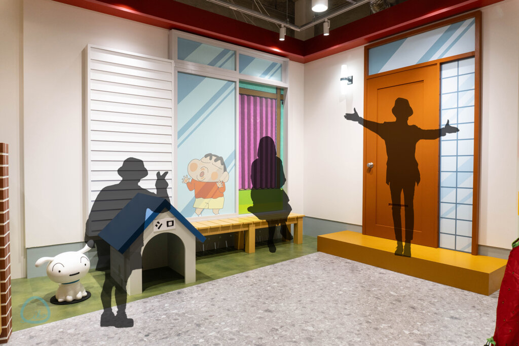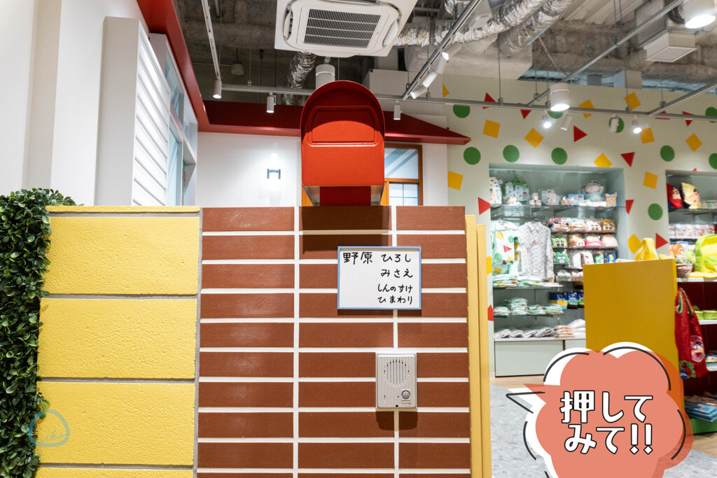 なんとしんちゃんち(野原家)が。表札の下にあるインターホンは、押してOK。押すと家のなかからお返事が。お返事パターンは複数ありますので、誰がでるかはやってのお楽しみです。
