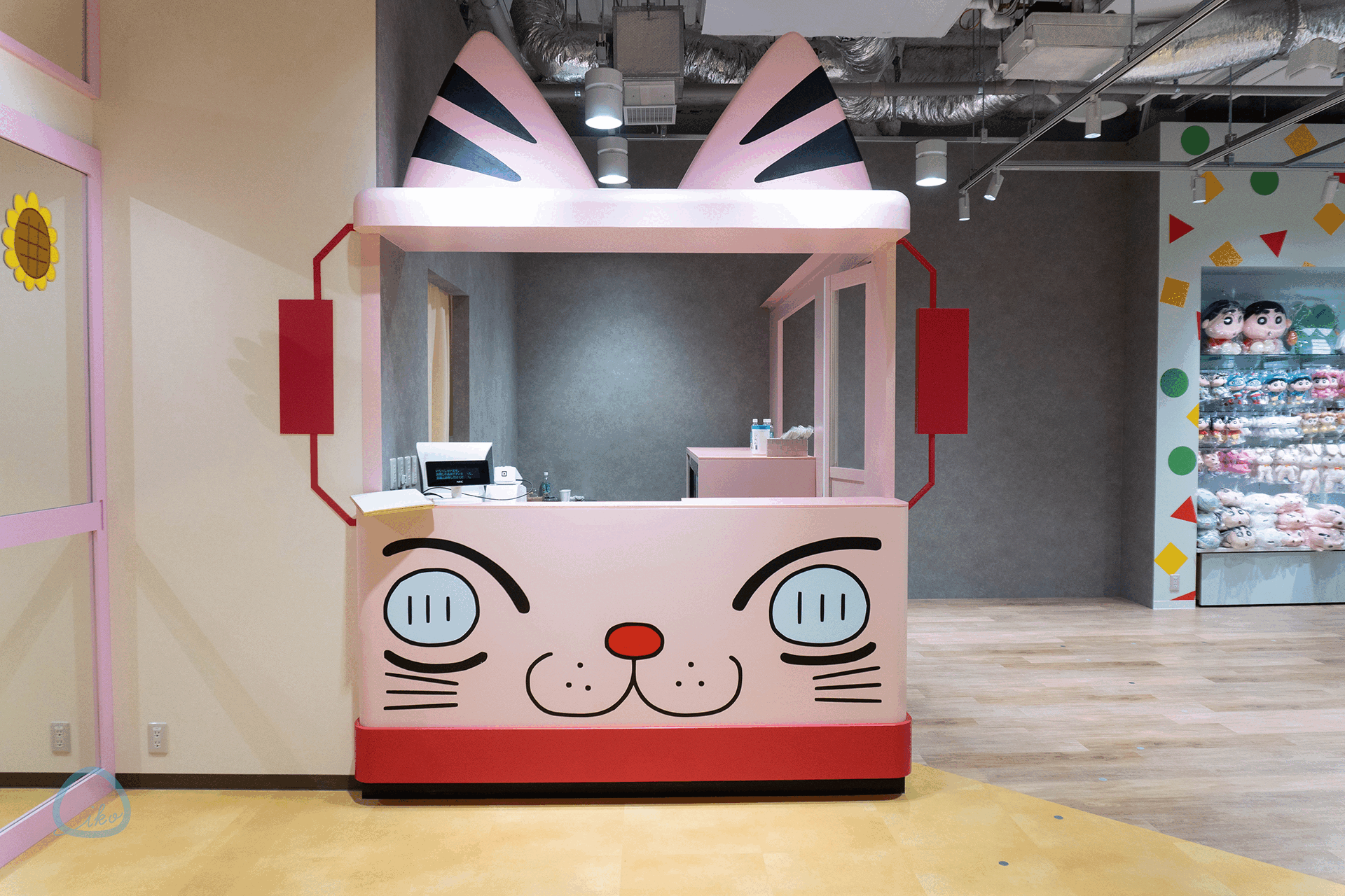 販売カウンターは、しんちゃんたちが使っている「幼稚園バス」仕様。一方イートインコーナーは「ふたば幼稚園」仕様に!! 細部まで入念に作り込んでありますので、じっくりご覧あれ。