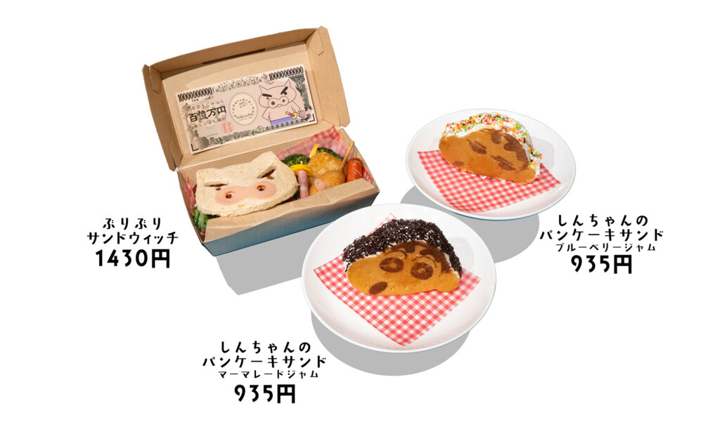 作品に登場する「ぶりぶりざえもん」を象ったハムカツ+ポテトサラダの「サンドウィッチ」のほか、マーマレード、またはブルーベリージャムから選べる、甘い「パンケーキサンド」を展開。