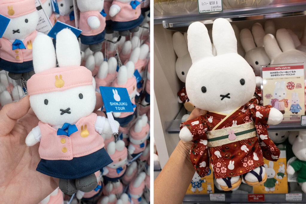 アパレル、雑貨、文具など、幅広く取り扱っていますが、やはり注目はぬいぐるみ系。写真左のキーチェーンは、新宿店限定となる「バスガイド仕様」。そのほかにも「和服(写真右)」や「袴」など、いろいろなミッフィーに出会えます♪