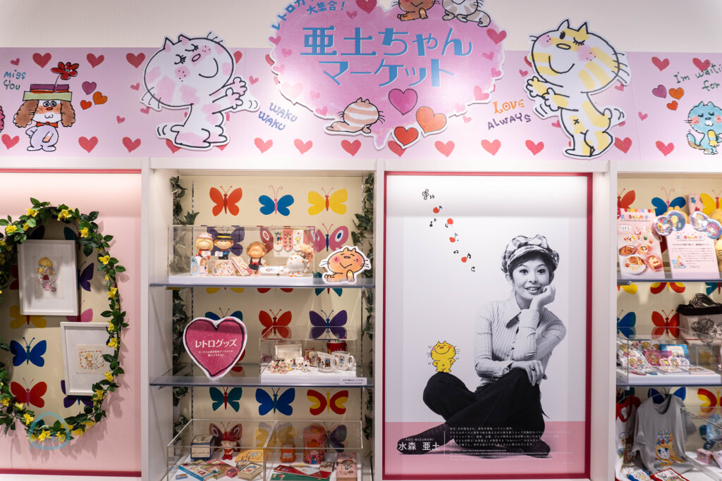 物販は3Fで展開しますが、1Fでは水森亜土さんが過去に手掛けた作品の複製原画展示のほか、現在入手できない当時モノのグッズなどを展示中。