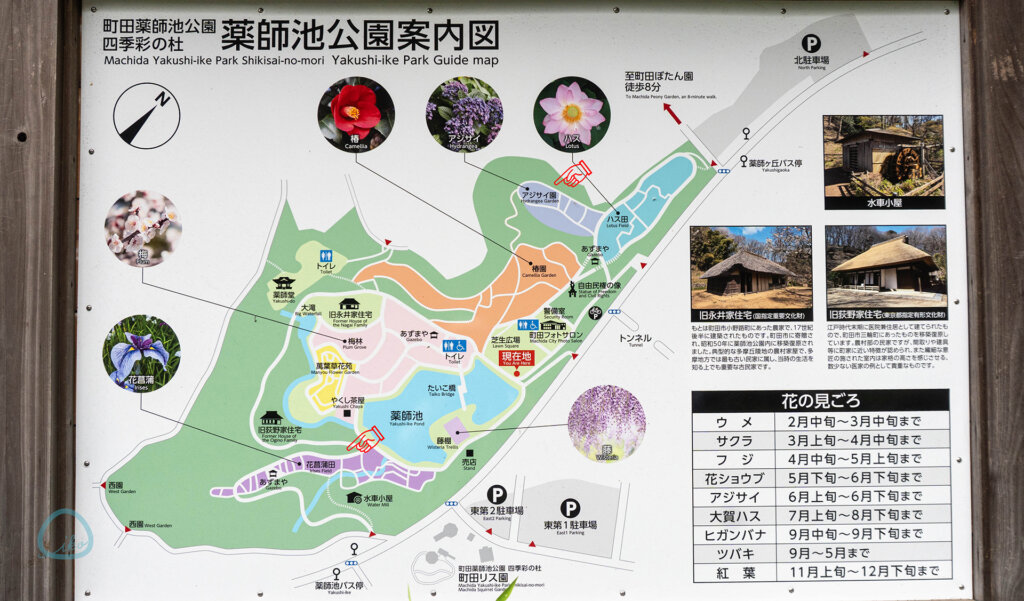 メイン会場となる「薬師池公園」は、「花菖蒲」「あじさい」ともエリア分けされており、「花菖蒲」は写真地図の左下の矢印部分(南西)。「あじさい」は園の北東の矢印付近に。両者の距離は5分くらい。