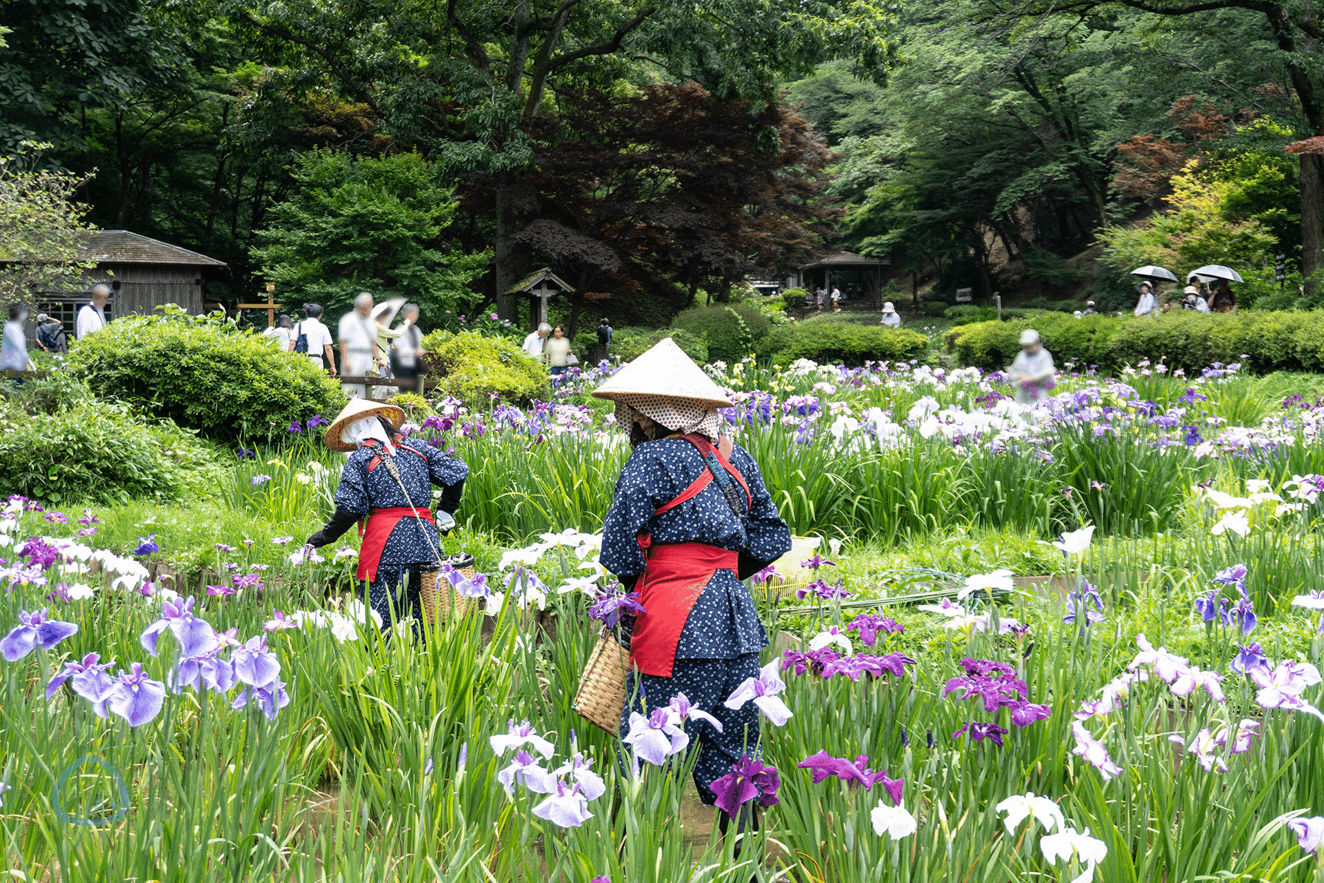 花摘みは、早乙女姿の絵になる花摘み娘さんが菖蒲田に入って行う地道な作業。頭の菅笠と紺がすりと呼ばれる装いが風情あることから、作業中は多くの方がカメラを構えておりました♪