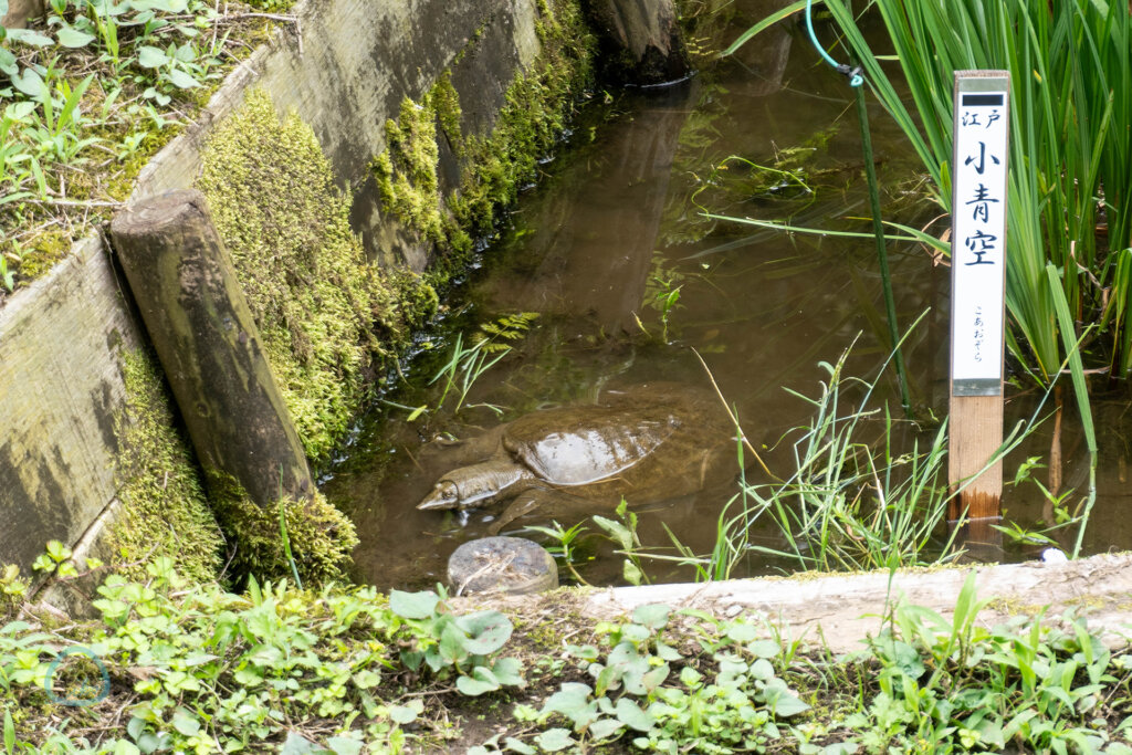 花菖蒲が植えられている「菖蒲田」をよーく見ると、なんとスッポンが! こんな予想外の出会いがあるもの楽しみの1つです♪