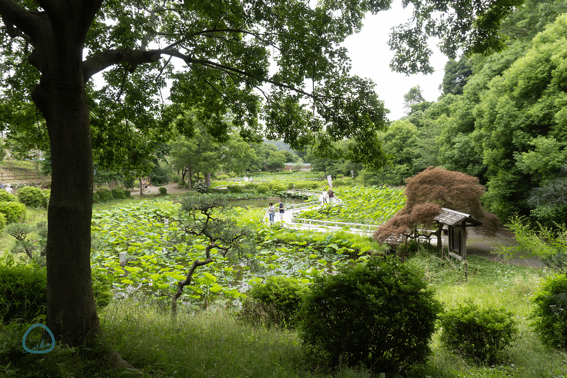 園の端には大きなハス池も。開花は7月下旬頃。