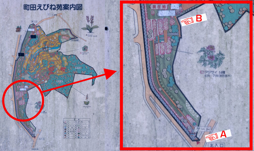 入り口は何カ所かあるものの、「薬師池公園」側からもっとも近いゲートは写真の矢印A(北入口/薬師中学校側)。もっとも見応えのあるスポット(写真の矢印B)までは徒歩移動です。