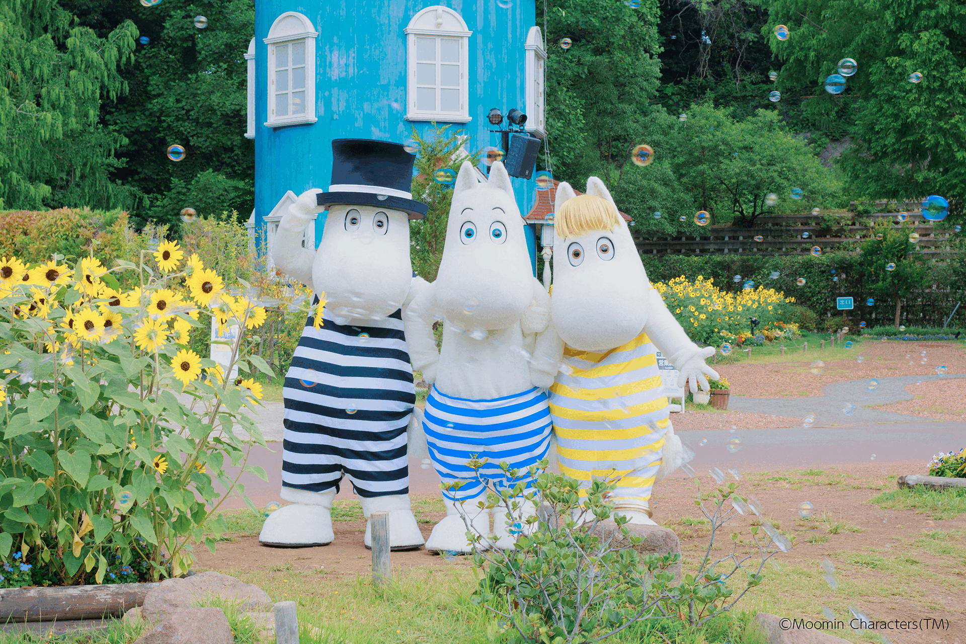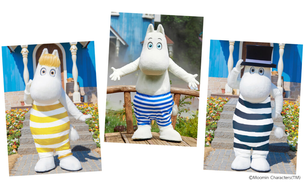 イベント期間中は、ムーミントロール(写真中央)、ムーミンパパ(同右)、スノークのおじょうさん(同左)のいずれかのキャラクターが園内に登場するグリーティングも実施。
