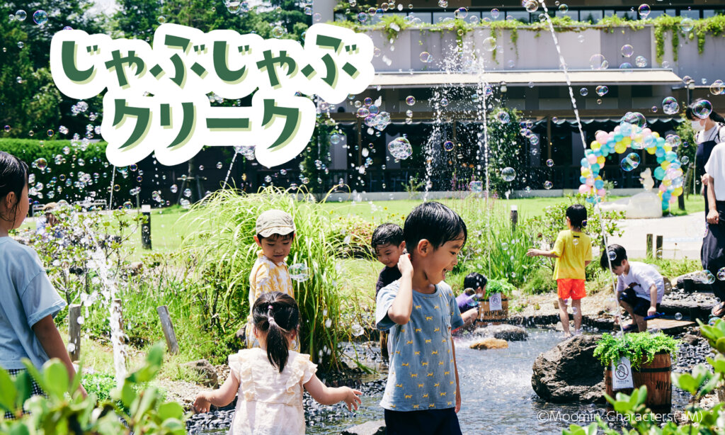 園内にあるムーミン谷を流れる小川がその舞台。参加者である子どもたちは、小川にドボン! 噴水のようにハジける水やシャボン玉の演出を楽しみながら、思い切りハメを外して遊べるんです。
