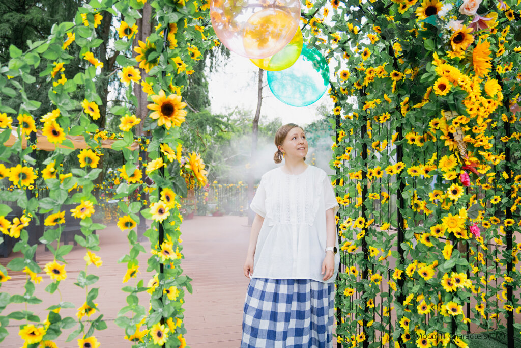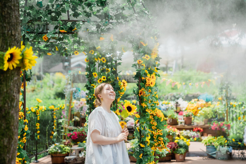 新コンテンツ「リトルミイのひまわりミストテラス」は、自身を包み込むような“ひまわり”と、モクモクと噴霧される“ミスト”のコラボレーションが楽しめます。