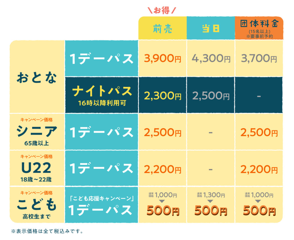 なんといっても注目は、高校生までが対象となる「こども」料金。ワンデーパスがなんと500円に!