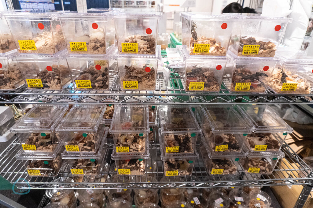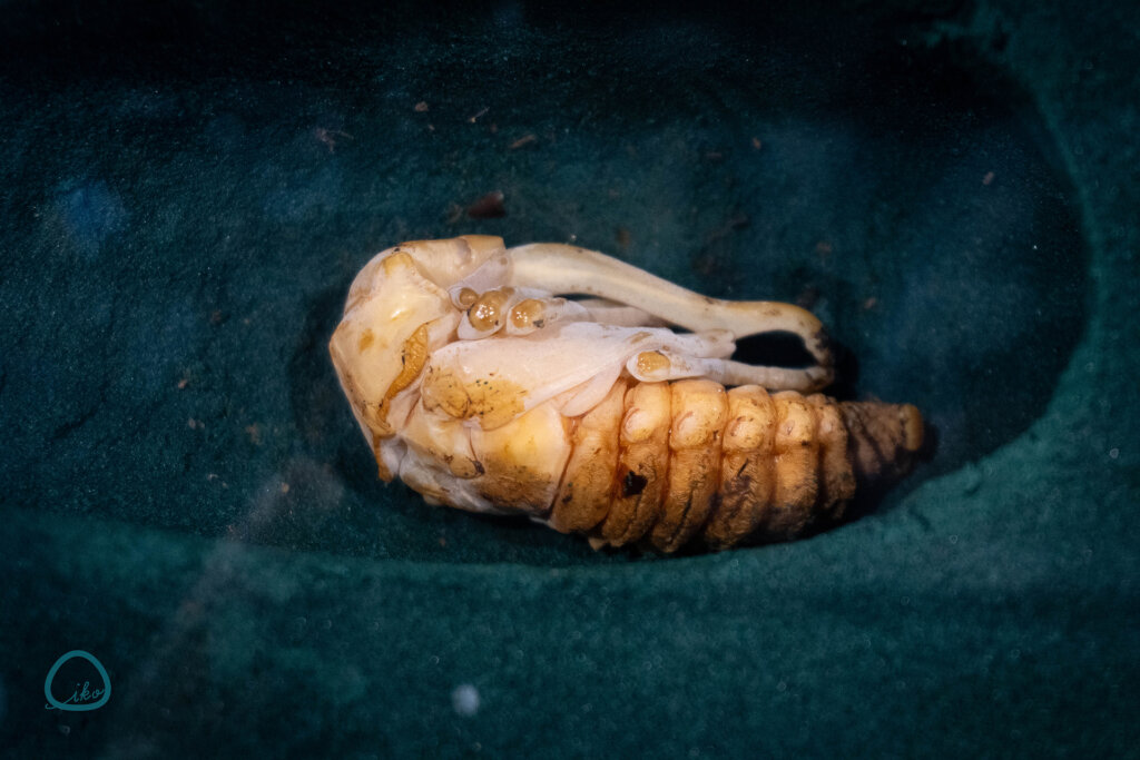 生体展示のなかには、「さなぎ」や「幼虫」も。写真のギラファノコギリクワガタのさなぎ。ほか、ヘラクレスオオカブトの幼虫展示もあり。