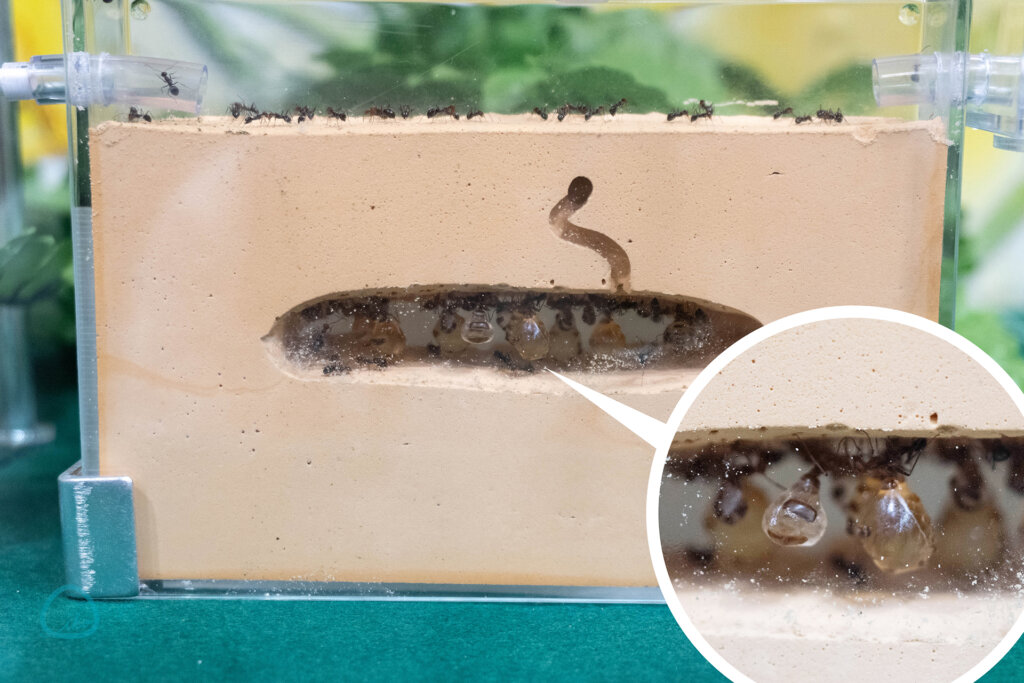 大昆虫展初登場となる「ミツツボアリ」。風船のような膜の中に蜜を貯める特殊なアリ。かなり小さいですので、よーくご覧あれ。