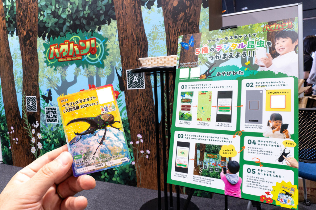 こちらは、専用アプリをスマホなどにダウンロードして楽しむ、デジタル昆虫採集「バグハン!」コーナー。