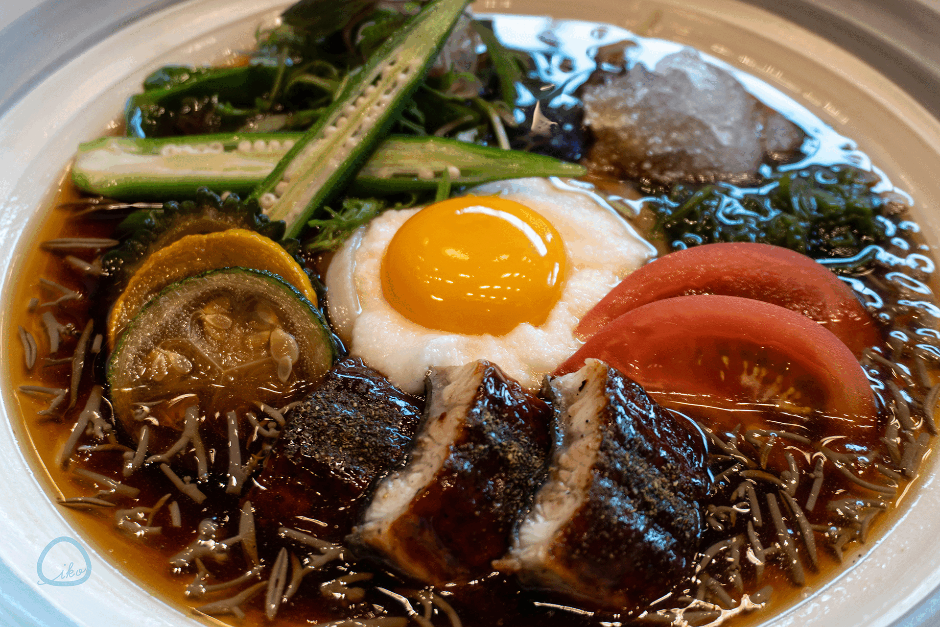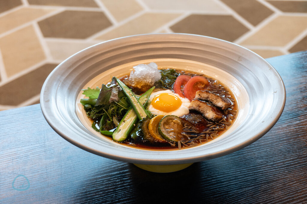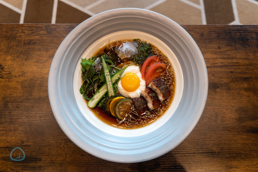 ポイントはふんだんに使った夏野菜。ベースとなるうどんの具として、オクラ、ズッキーニ、ゴーヤ、めかぶ、ミョウガ、ジュンサイ、ベビーリーフ、トマト、ニワトリの卵、そしてうなぎを使った贅沢な“冷やしうどん”です!