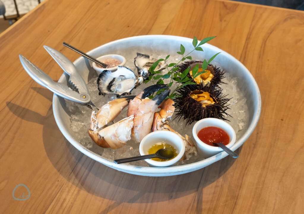 スコットランド産のグランクラブと呼ぶカニと、宮城・女川の牡蠣、北海道産のウニの豪華な海鮮プレート。カニミソを使った生クリームソースなど、3つの特製ソースに付けて召し上がれ。2人前で提供。