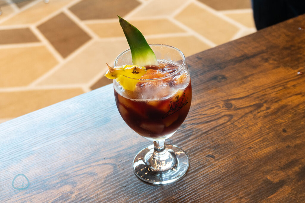 マンゴー、グァバ、パインアップルで作ったトロピカルジュースの特製氷と、葡萄、ピーチ、マンゴーの果肉を入れたグラスに、ワインを注いで楽しむサングリアと呼ばれるカクテルを提案。